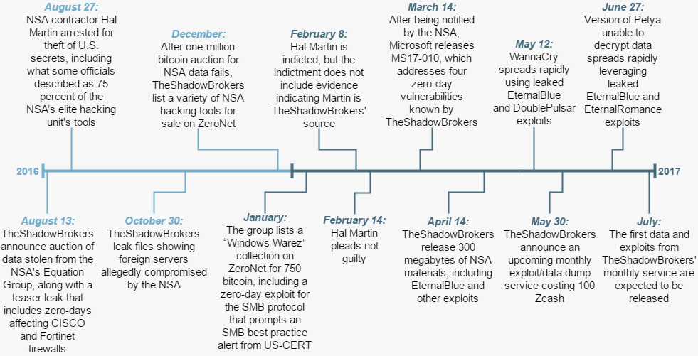 At this point, it remains unclear exactly how the sensitive hacking tools and exploits were stolen from the NSA, although investigators are pursuing several theories. What is clear is that multiple individuals were in possession of that data — including NSA contractor Harold T. Martin III, who was arrested two weeks after TheShadowBrokers announced its auction of NSA tools.
